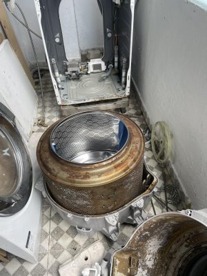 - Tháo cục xi măng cân lồng giặt và bộ phận cấp nước, xà phòng và mặt điều khiển: